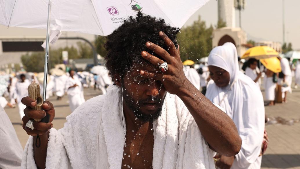 當地時間2024年6月15日,沙特阿拉伯,一名朝覲者將水潑在頭上降溫。視覺中國 圖